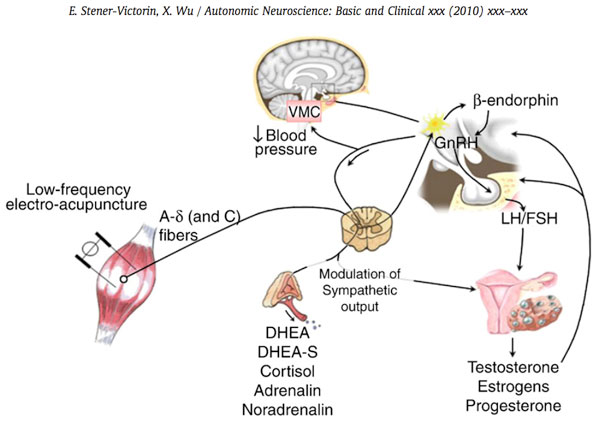 전침은 교감신경계, 내분비계, 신경내분비계 등의 매커니즘을 거쳐 생식기관에 영향을 주는 것으로 알려져있습니다. 침이 특정한 경혈에 자침되고 특정한 방식에 의해 자극을 받을 때, 신경학적 반사가 관련된 기관으로 전달됩니다. 가령, 침이 무릎, 아래허리, 복부에 특정 부위에 자침되게 되면 난소에 영향을 주게 됩니다. 신경계의 시그널을 뇌로 전달되고 뇌는 다시 기관에 영향을 주게 됩니다. 이러한 효과는 호르몬, 뉴로펩타이드 등의 측정을 통해 조사되었습니다.